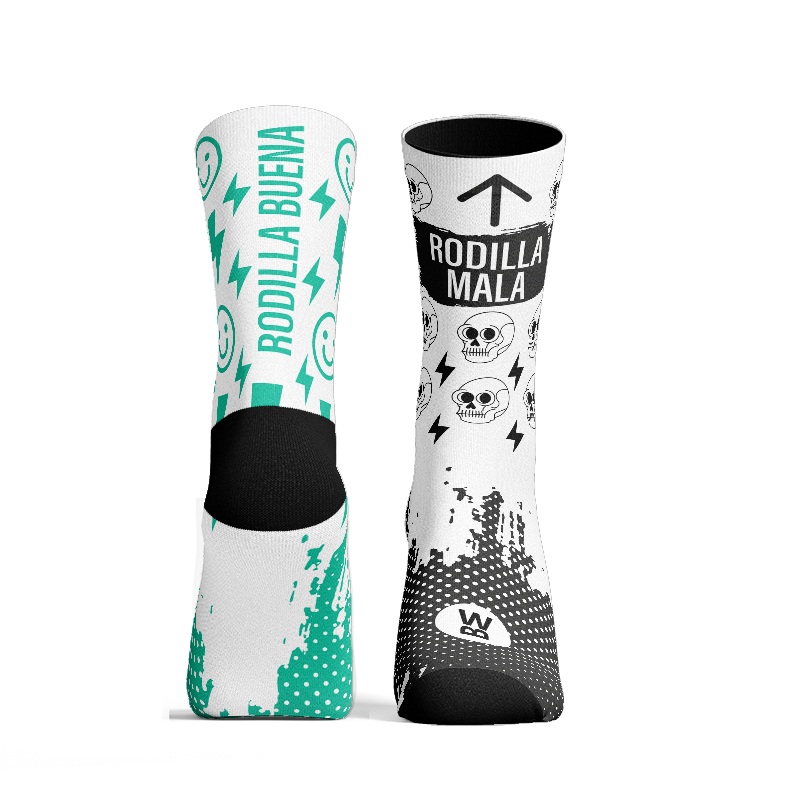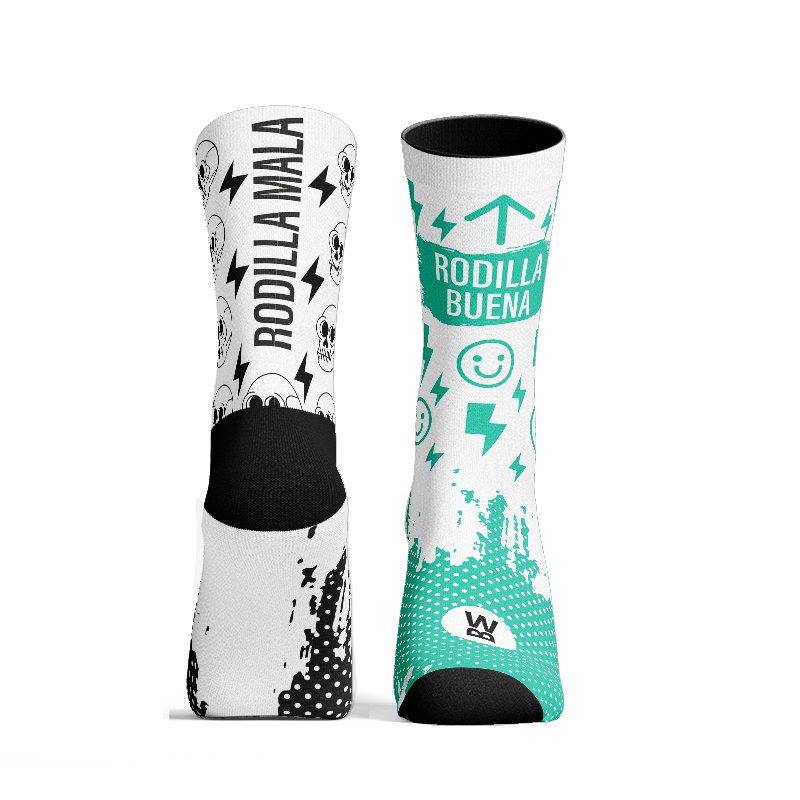 - Impresión 360º que permite diseños sin cortes en los laterales ni blanqueos al estirar el calcetín, con tintas base al agua que respetan el medio ambiente.